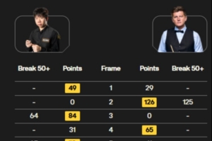 雷佩凡打出单杆64、65、51、52分,瑞恩·戴打出125分破百,雷佩凡5-4领先戴结束第一阶段。