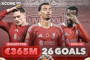 利物浦总共花费3.65亿欧引进维尔茨、埃基蒂克、伊萨克,三人本赛季总共打入26球,只比迪亚斯多攻入3球。